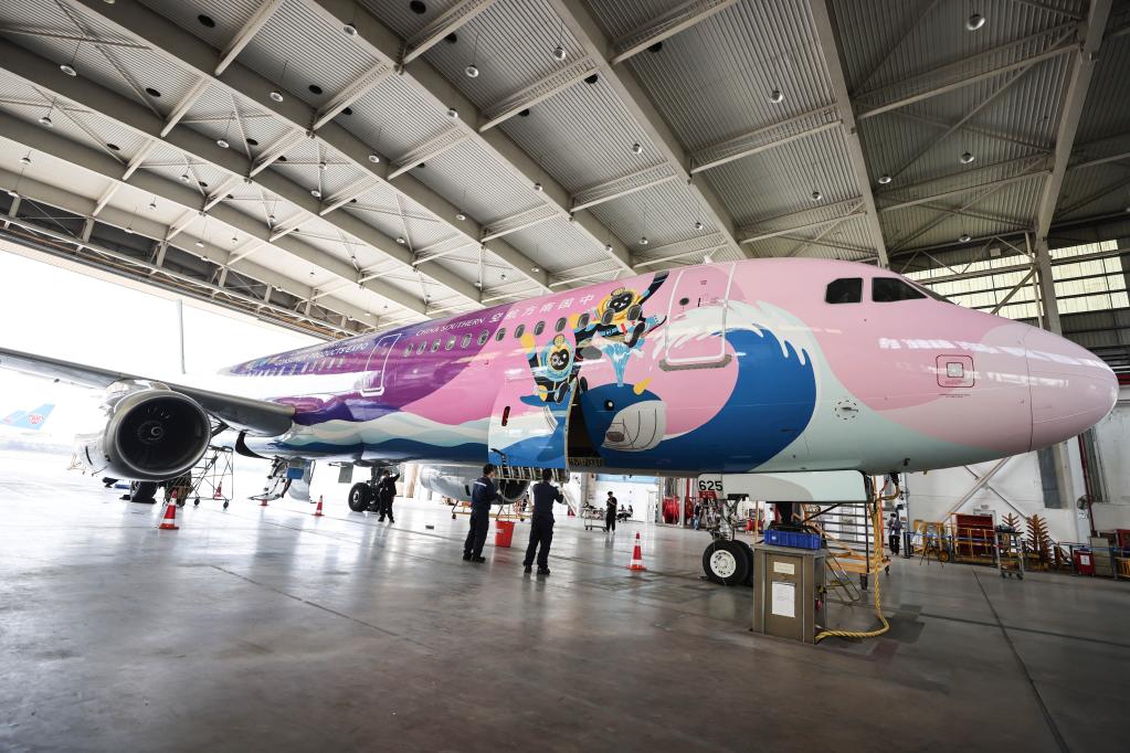 2023年3月7日,在??诿捞m國際機(jī)場,南航機(jī)務(wù)人員對“消博號(hào)”彩繪飛機(jī)進(jìn)行深度檢查。新華社記者 張麗蕓 攝