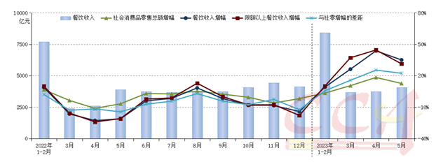 國(guó)家統(tǒng)計(jì)局6月15日發(fā)布的5月份國(guó)民經(jīng)濟(jì)運(yùn)行數(shù)據(jù)顯示,2023年5月份,全國(guó)餐飲收入4070億元,同比上升35.1%;限額以上單位餐飲收入1084億元,同比上升31.4%。2023年1-5月,全國(guó)餐飲收入19958億元,同比上升22.6%;限額以上單位餐飲收入5086億元,同比上升25.4%。