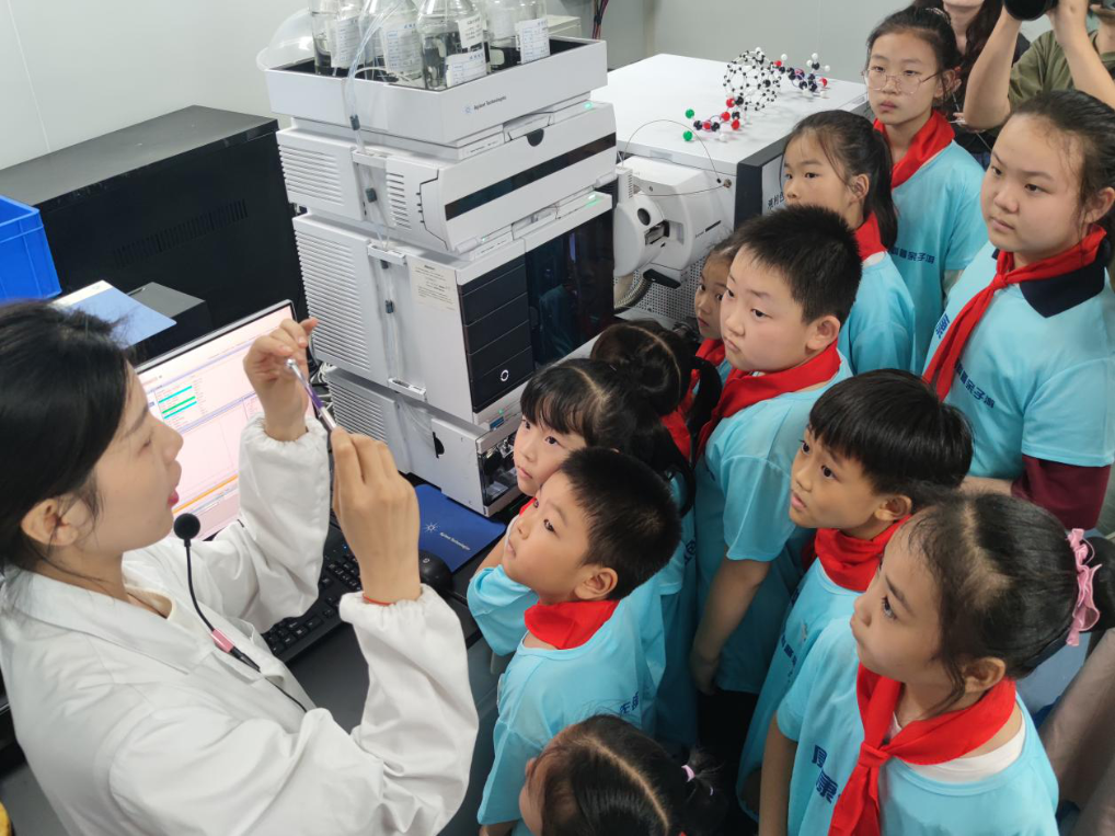 7月11日,在武漢市食品化妝品檢驗所,工作人員向孩子們展示食品檢測過程。 (武漢市市場監(jiān)督管理局供圖)