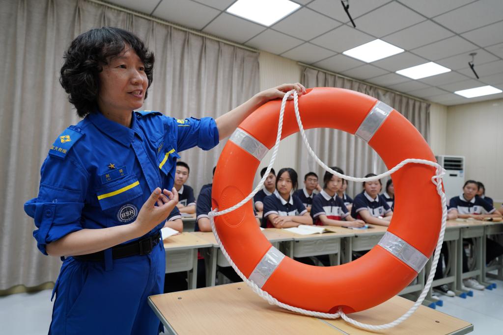 河北邢臺藍天救援隊志愿者指導(dǎo)邢臺市第八中學學生使用救生圈。 新華社記者駱學峰 攝