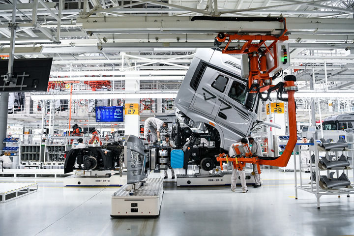 在位于吉林長春的一汽解放汽車有限公司J7智能工廠內(nèi),工人在AGV(搬運(yùn)機(jī)器人)上裝配車輛(2023年6月12日攝)。新華社記者 顏麟蘊(yùn) 攝