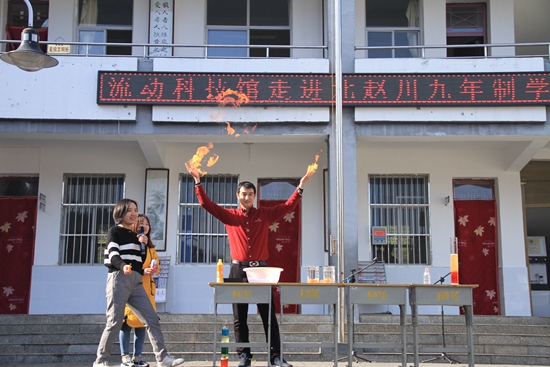 付佳樂(lè)與指導(dǎo)教師一起為丹鳳縣武關(guān)鎮(zhèn)北趙川九年制學(xué)校展示趣味科學(xué)實(shí)驗(yàn)。受訪者供圖