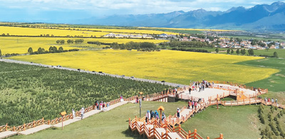 7月,青海省門源回族自治縣油菜花綻放,一蓬蓬、一簇簇迎風舞動,宛如金色的海洋。付利攝 |