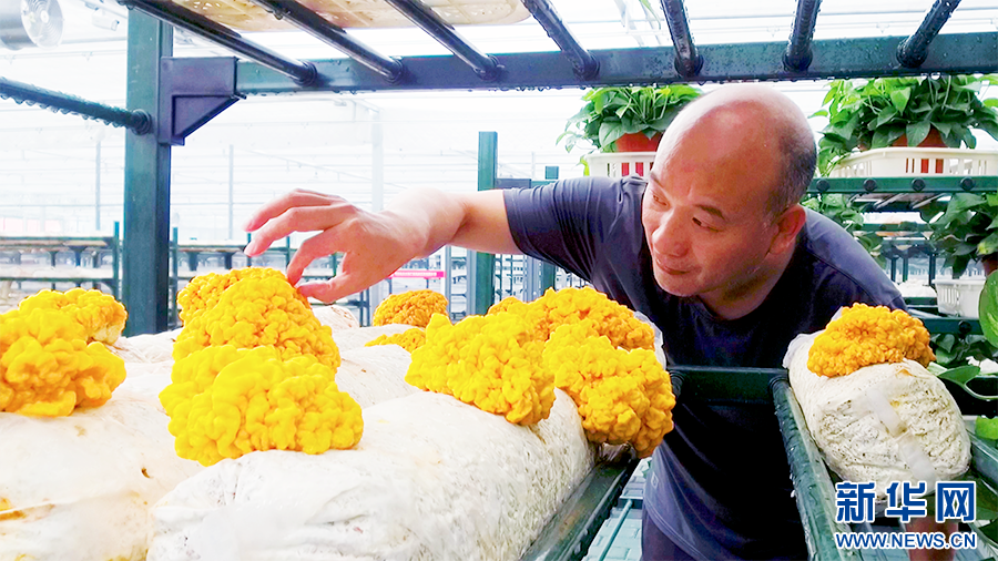 在金米智慧農(nóng)業(yè)產(chǎn)業(yè)園里,技術(shù)負(fù)責(zé)人陳盛林查看金耳長(zhǎng)勢(shì)。新華網(wǎng) 楊喜龍 攝