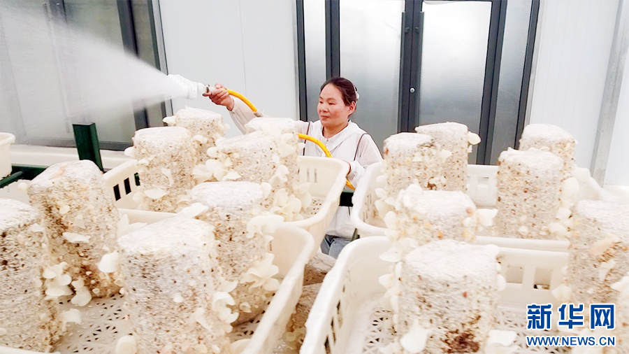 在金米智慧農(nóng)業(yè)產(chǎn)業(yè)園里,金米村村民張寨勤給大棚里的木耳補(bǔ)水。新華網(wǎng) 楊喜龍 攝