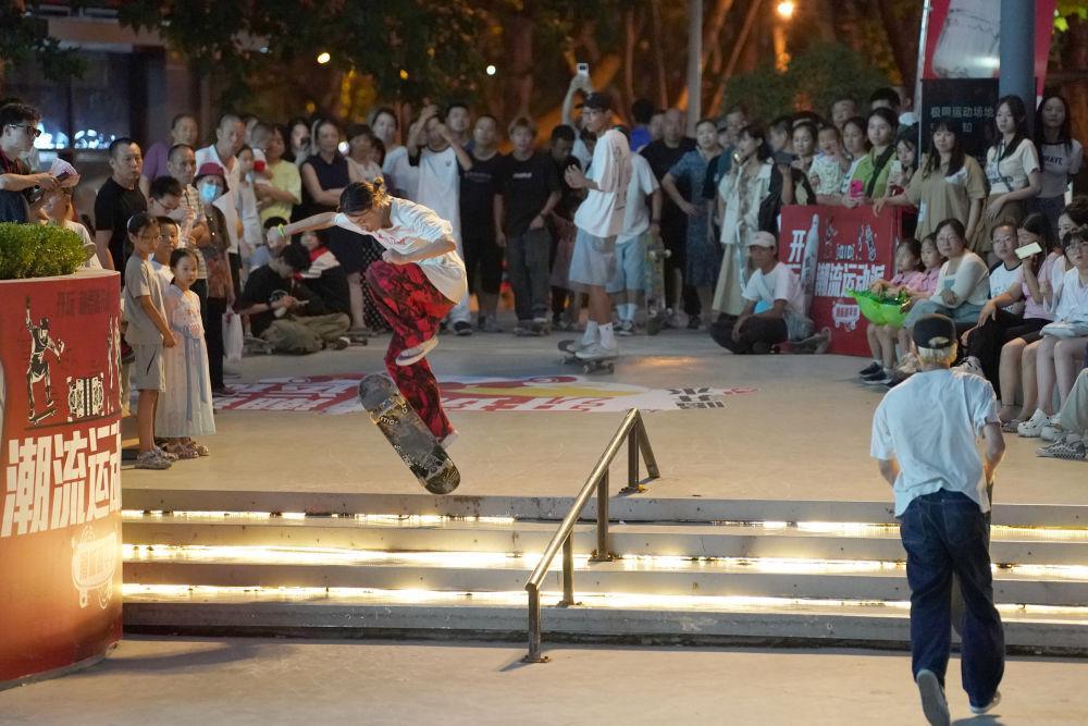 7月30日,滑板愛好者在西安市一商業(yè)街區(qū)進(jìn)行滑板表演有獎(jiǎng)競(jìng)賽活動(dòng)。新華社記者 邵瑞 攝