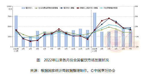 中國(guó)烹飪協(xié)會(huì)分析,7月份,全國(guó)餐飲收入、限上餐飲收入增速分別較上年同期上漲17.3%、12.1%。1-7月份,全國(guó)餐飲收入、限上餐飲收入增速分別比上年同期上升27.3個(gè)、28.2個(gè)百分點(diǎn)。