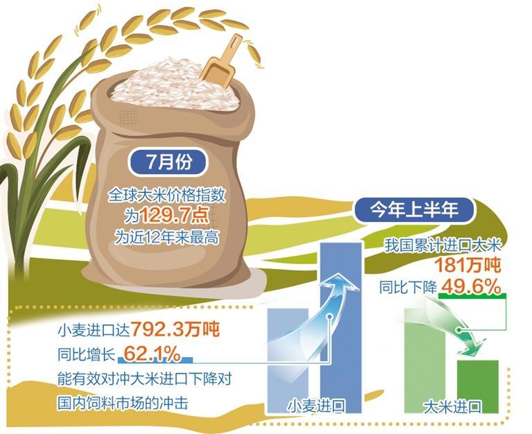 “為了確保大米進(jìn)口穩(wěn)定性,我國(guó)各類(lèi)進(jìn)口主體也在推進(jìn)大米進(jìn)口多元化,避免來(lái)源地和品種過(guò)于集中帶來(lái)的進(jìn)口安全風(fēng)險(xiǎn)。”彭超說(shuō)。一方面,推進(jìn)大米進(jìn)口來(lái)源地多元化。我國(guó)大米進(jìn)口來(lái)源地包括越南、緬甸、泰國(guó)、印度、巴基斯坦、柬埔寨等主產(chǎn)國(guó)。從去年10月起,我國(guó)開(kāi)始逐步減少印度碎米進(jìn)口,印度已從過(guò)去幾年中國(guó)最大的大米供應(yīng)商滑落至第四位。另一方面,推進(jìn)糧食進(jìn)口品種多元化。減少大米進(jìn)口的同時(shí),增加飼用小麥進(jìn)口。今年上半年,我國(guó)小麥進(jìn)口量達(dá)到792.3萬(wàn)噸,較去年同期增長(zhǎng)62.1%,能夠有效對(duì)沖大米進(jìn)口下降對(duì)國(guó)內(nèi)飼料市場(chǎng)的沖擊。