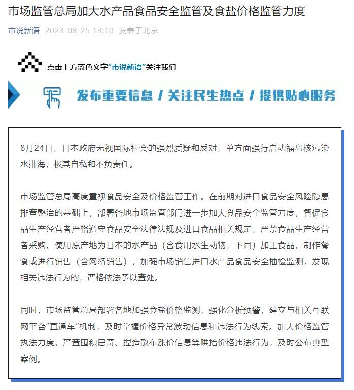 市場(chǎng)監(jiān)管總局高度重視食品安全及價(jià)格監(jiān)管工作。在前期對(duì)進(jìn)口食品安全風(fēng)險(xiǎn)隱患排查整治的基礎(chǔ)上,部署各地市場(chǎng)監(jiān)管部門進(jìn)一步加大食品安全監(jiān)管力度,督促食品生產(chǎn)經(jīng)營(yíng)者嚴(yán)格遵守食品安全法律法規(guī)及進(jìn)口食品相關(guān)規(guī)定,嚴(yán)禁食品生產(chǎn)經(jīng)營(yíng)者采購(gòu)、使用原產(chǎn)地為日本的水產(chǎn)品(含食用水生動(dòng)物,下同)加工食品、制作餐食或進(jìn)行銷售(含網(wǎng)絡(luò)銷售),加強(qiáng)市場(chǎng)銷售進(jìn)口水產(chǎn)品食品安全抽檢監(jiān)測(cè),發(fā)現(xiàn)相關(guān)違法行為的,嚴(yán)格依法予以查處。