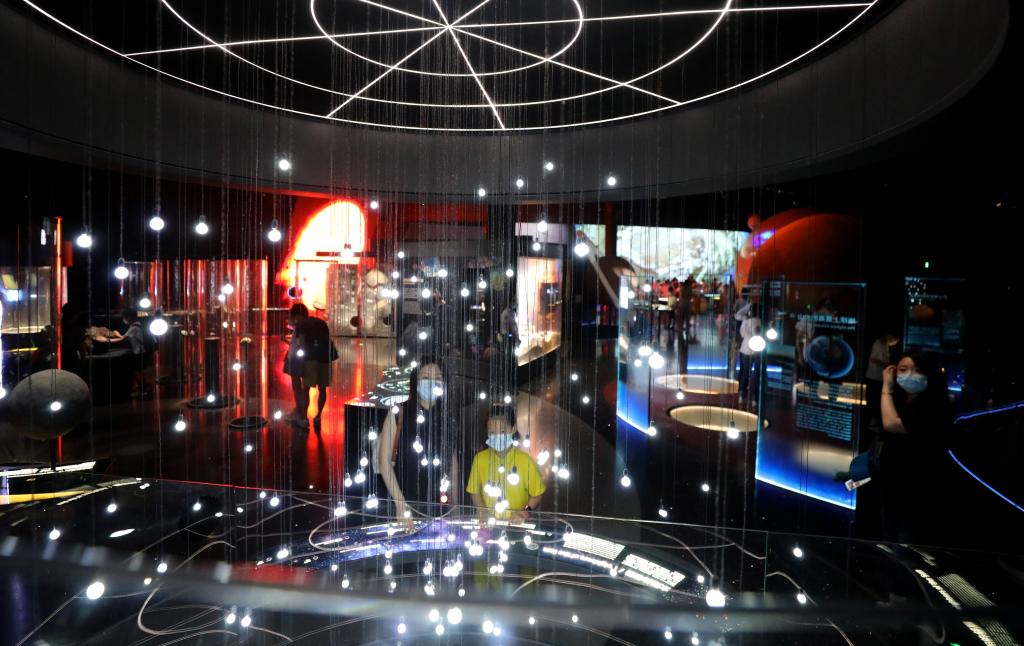 參觀者在上海天文館“家園”展區(qū)內(nèi)一個(gè)名為“太陽的鄰居”的裝置展品前駐足觀看。新華社記者 方喆 攝
