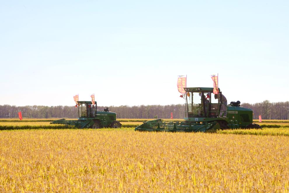 北大荒集團普陽農(nóng)場有限公司第三管理區(qū)水稻種植綜合標準化示范區(qū)的割曬機分段收獲現(xiàn)場。(李道民 攝)