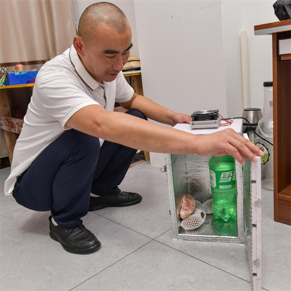 只有初中文憑的楊波就開始學(xué)習(xí)冰箱知識(shí),了解冰箱原理結(jié)構(gòu):為什么會(huì)制冷還能調(diào)節(jié)溫度?等等,做到了了然于胸,又購買了冷卻片、制冷片、散熱片、風(fēng)扇、溫度計(jì)、封條等必備用料,自己又在工地找到了廢棄的塑膠板,在家具店里找來隔熱錫紙,經(jīng)過一番折騰,一臺(tái)高60 厘米、寬40厘米、厚40厘米的手工小冰箱做成功了。使用2個(gè)月來,最低溫度可達(dá)2攝氏度。效果非常好!