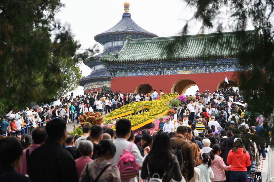10月2日,游客在天壇公園內(nèi)排隊前往祈年殿參觀。新華社記者 鞠煥宗 攝