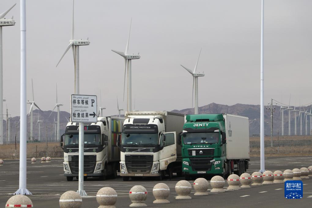 11月5日,入境貨車在阿拉山口公路口岸停車場(chǎng)等待檢查結(jié)果。新華社記者 趙晨捷 攝