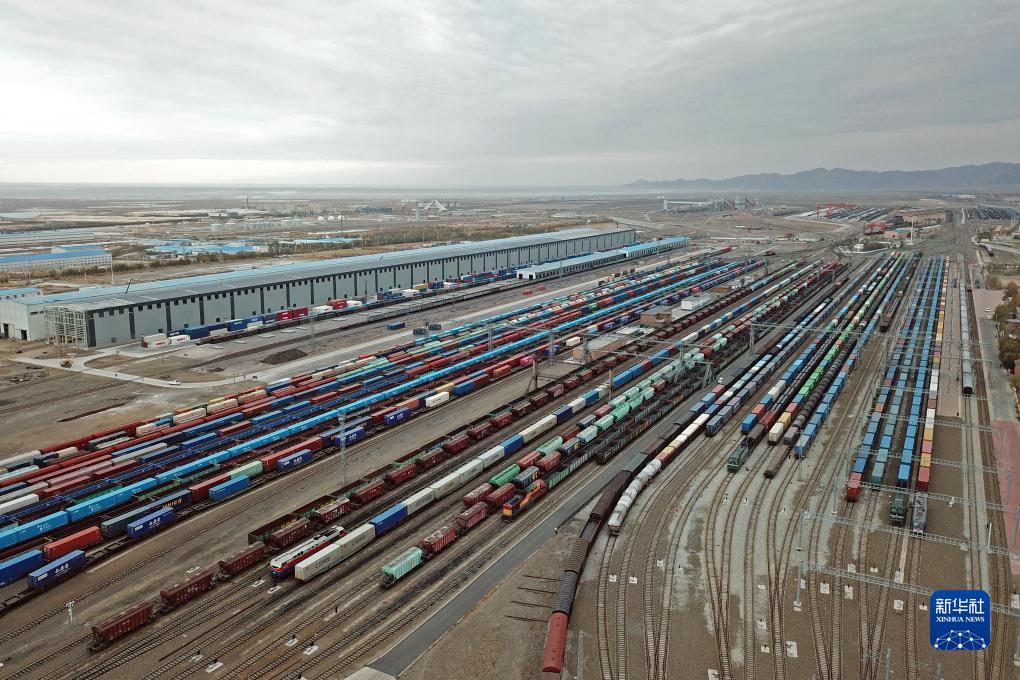 這是在阿拉山口站編組場(chǎng)拍攝的集結(jié)待發(fā)的貨運(yùn)列車(無人機(jī)照片,11月4日攝)。新華社記者 李鑫 攝