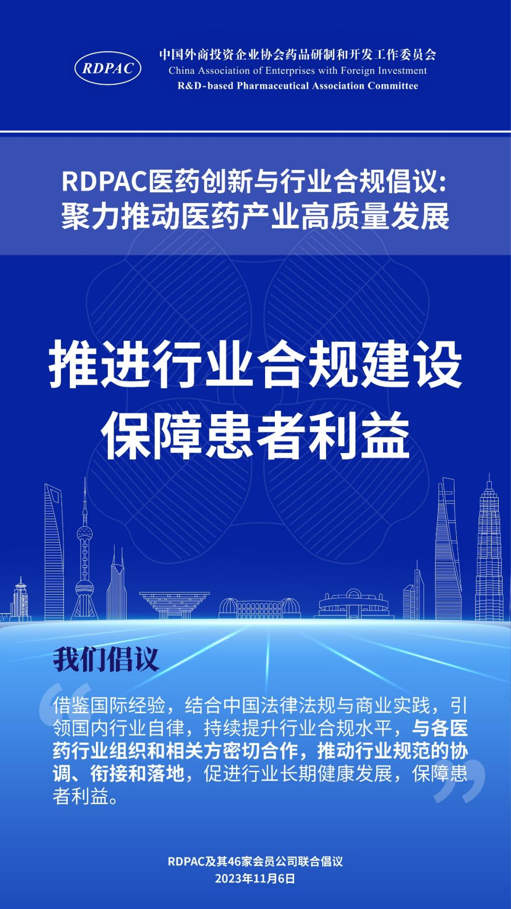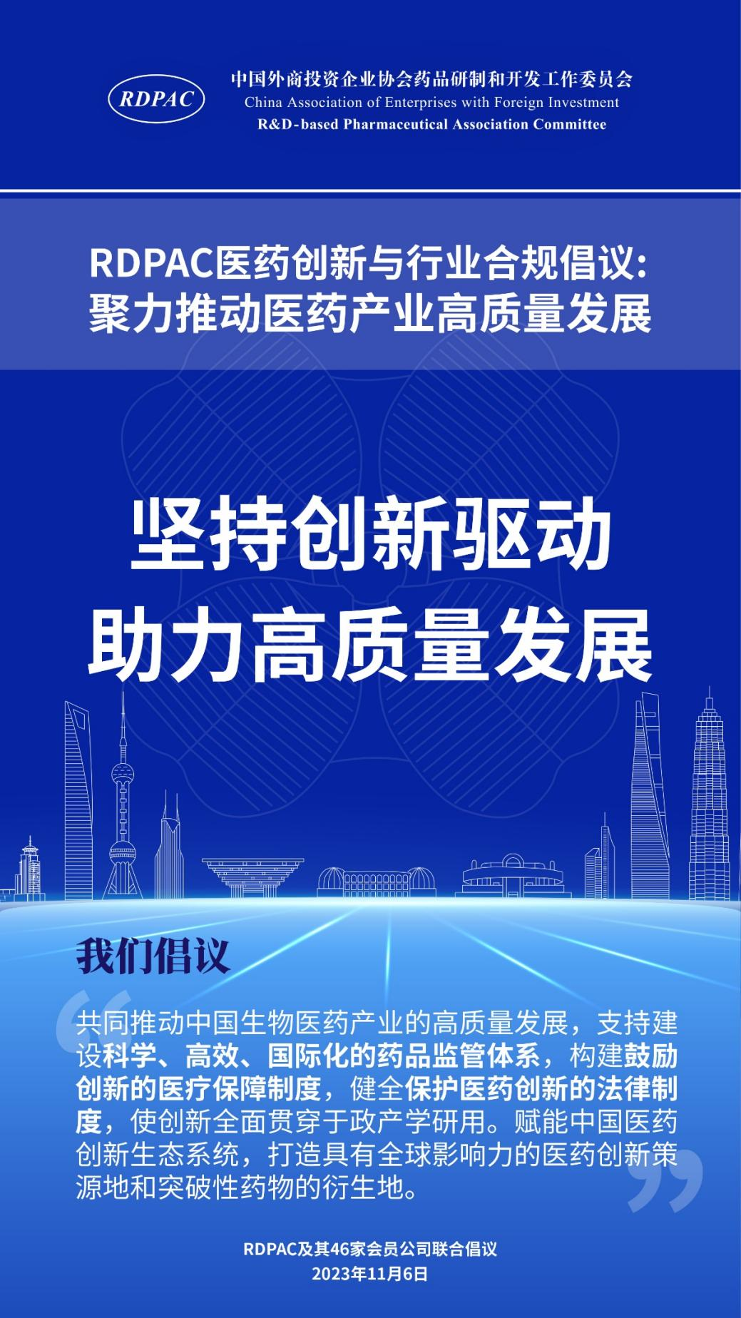 11月6日,中國外商投資企業(yè)協(xié)會藥品研制和開發(fā)工作委員會 (以下簡稱 “RDPAC”)及其成員公司在華負責人共同發(fā)起“RDPAC醫(yī)藥創(chuàng)新與行業(yè)合規(guī)倡議”,致力于打造充滿活力的醫(yī)藥創(chuàng)新生態(tài)系統(tǒng)、完善的行業(yè)合規(guī)體系,聚力推動中國醫(yī)藥產(chǎn)業(yè)的高質(zhì)量發(fā)展,建設(shè)健康中國。