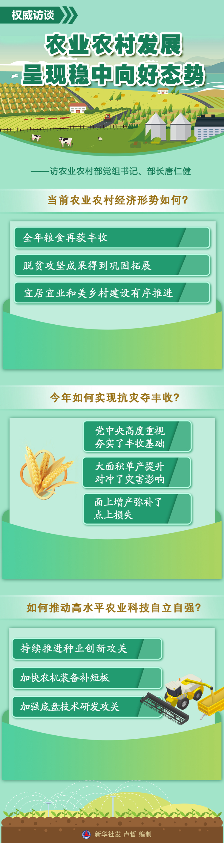答:習(xí)近平總書記指出,“穩(wěn)住農(nóng)業(yè)基本盤、守好‘三農(nóng)’基礎(chǔ)是應(yīng)變局、開新局的‘壓艙石’”“推進(jìn)農(nóng)業(yè)現(xiàn)代化是實(shí)現(xiàn)高質(zhì)量發(fā)展的必然要求”。今年以來(lái),農(nóng)業(yè)農(nóng)村部認(rèn)真貫徹落實(shí)黨中央、國(guó)務(wù)院決策部署,全力抓好以鄉(xiāng)村振興為重心的“三農(nóng)”各項(xiàng)工作,農(nóng)業(yè)農(nóng)村發(fā)展呈現(xiàn)穩(wěn)中向好態(tài)勢(shì):