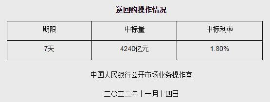 據(jù)央行網(wǎng)站消息,為維護(hù)銀行體系流動(dòng)性合理充裕,2023年11月14日人民銀行以利率招標(biāo)方式開(kāi)展了4240億元逆回購(gòu)操作,中標(biāo)利率1.80%,期限為7天。具體情況如下: