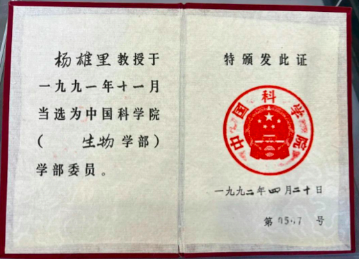 證書(shū)左側(cè)頁(yè)上寫(xiě)著:“楊雄里教授于1991年11月當(dāng)選為中國(guó)科學(xué)院生物學(xué)部委員。”這里所說(shuō)的學(xué)部委員就是現(xiàn)在我們熟知的中國(guó)科學(xué)院院士。
