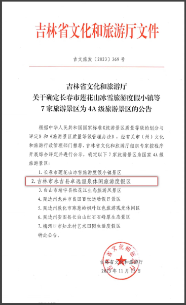 近日, 根據(jù)國家《旅游景區(qū)質(zhì)量等級的劃分與評定》和《旅游景區(qū)質(zhì)量等級管理辦法》,經(jīng)相關(guān)部門推薦,吉林省文化和旅游廳組織專家按程序開展綜合評定并進行公示,確定金恪集團旗下吉林卓遠(yuǎn)溫泉休閑旅游度假區(qū)等7家旅游景區(qū)成為國家4A級旅游景區(qū)。