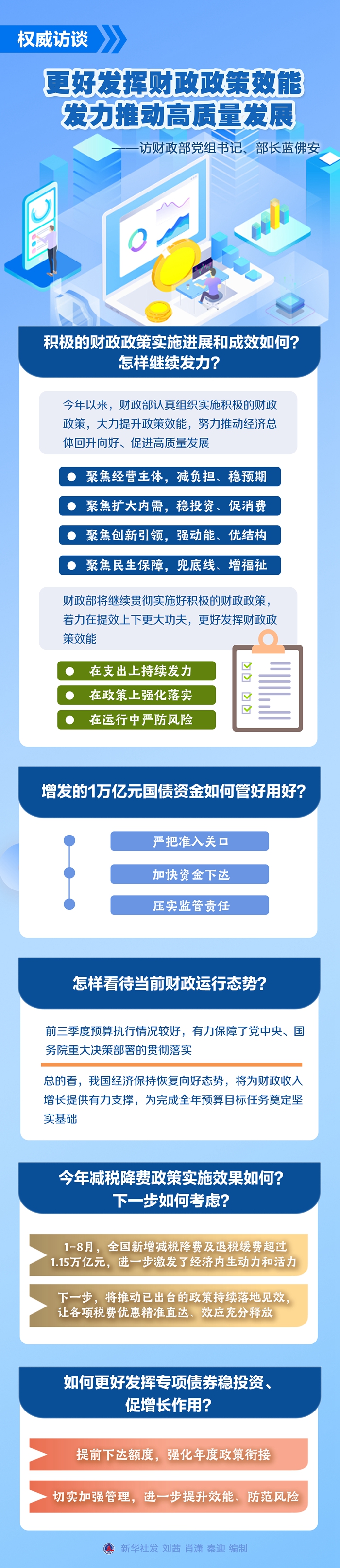 財政政策是國家宏觀調(diào)控的重要手段。下一步,財政政策還將如何發(fā)力?增發(fā)的國債怎樣用好?財政運行態(tài)勢如何?新華社記者采訪了財政部黨組書記、部長藍(lán)佛安。