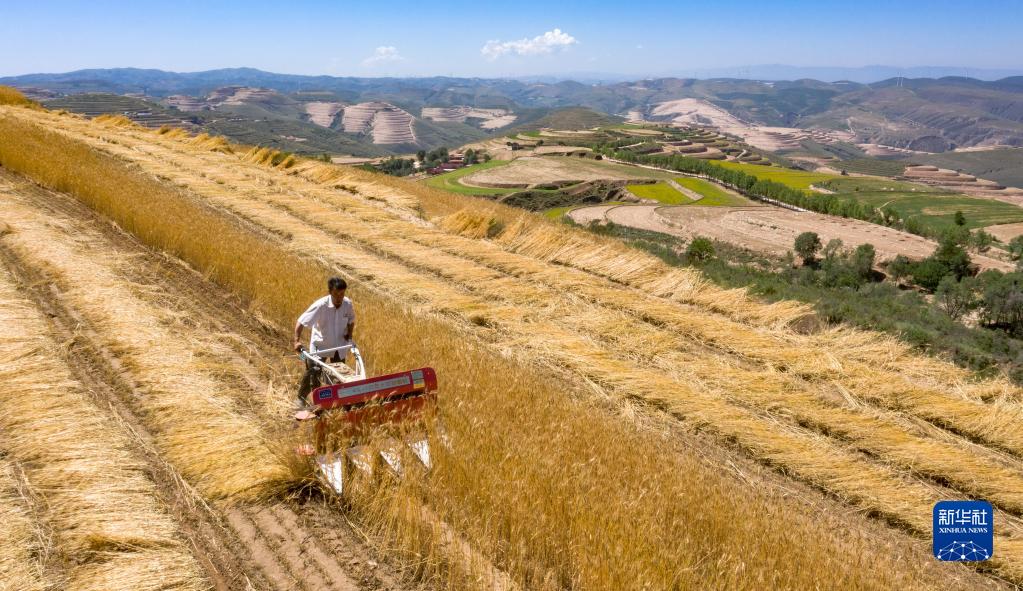 近日,寧夏西海固地區(qū)種植的冬小麥陸續(xù)進(jìn)入收割季節(jié)。旱塬、梯田上一片金黃,農(nóng)民操作著收割機(jī)械在其中忙碌。據(jù)了解,今年固原市夏糧面積42.89萬畝,其中冬小麥36.04萬畝。