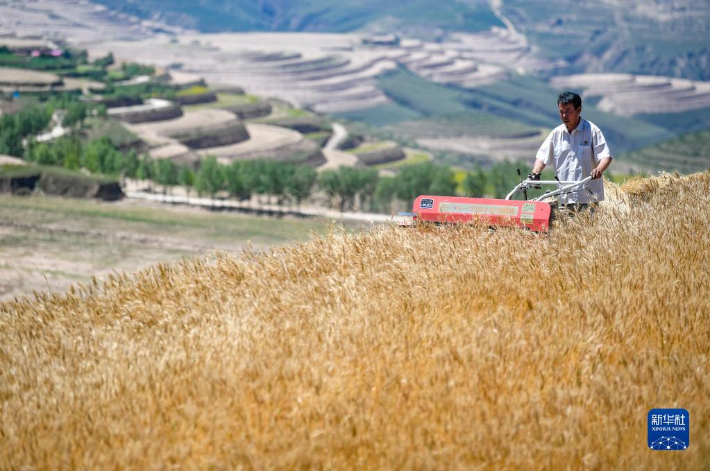 7月3日,寧夏固原市原州區(qū)炭山鄉(xiāng)炭山村村民操作小型割曬機(jī)收割冬小麥。新華社記者 馮開華 攝