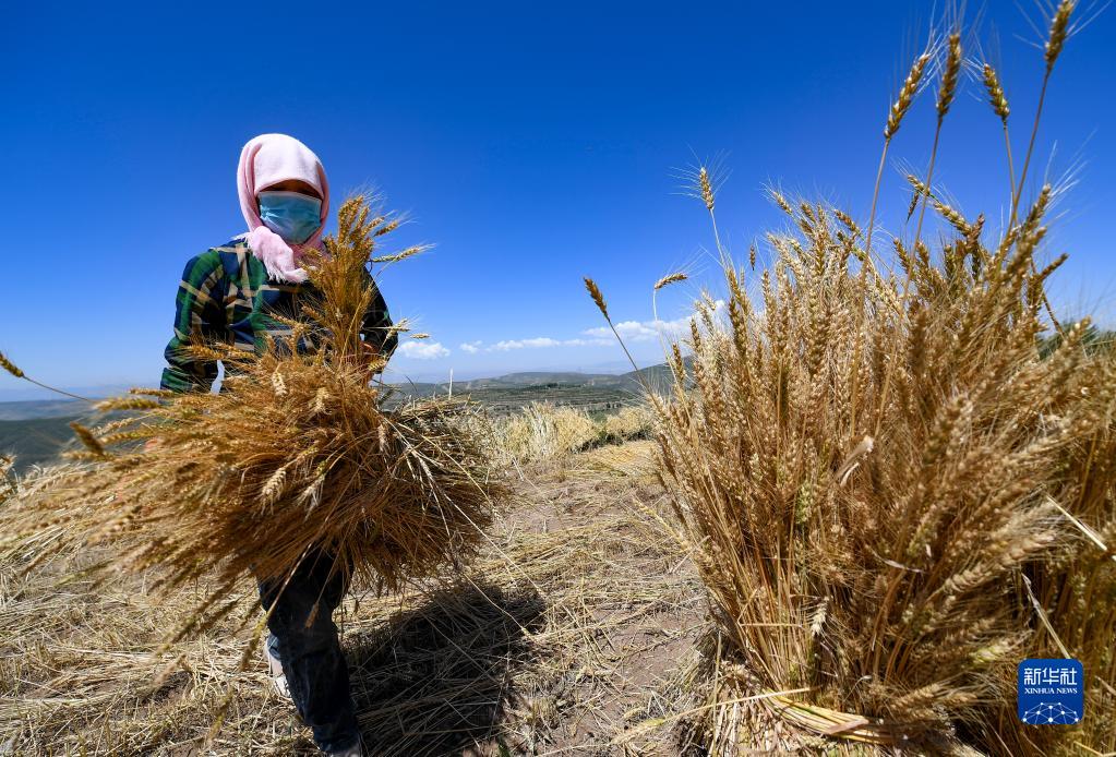 7月3日,寧夏固原市原州區(qū)炭山鄉(xiāng)炭山村村民將收割的冬小麥打捆。新華社記者 馮開華 攝