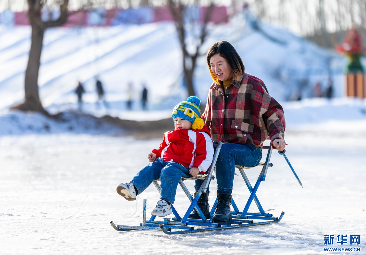 12月7日,家長陪伴孩子在呼和浩特市玉泉區(qū)大庫倫村“冰雪大世界”內(nèi)體驗(yàn)滑冰車。新華網(wǎng)發(fā)(丁根厚 攝)