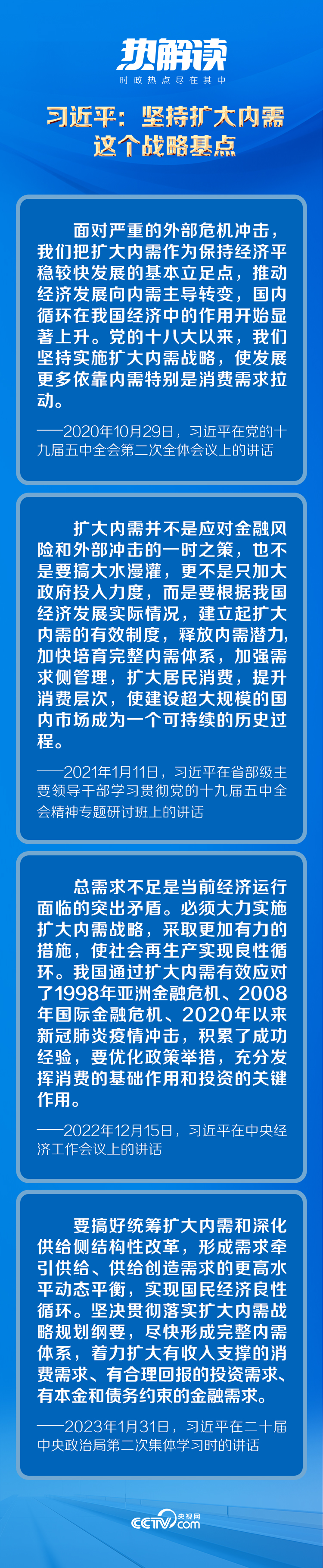 黨的十八大以來,習(xí)近平總書記從我國經(jīng)濟(jì)運(yùn)行的實(shí)際出發(fā),對擴(kuò)大內(nèi)需作出了一系列重要論述,為實(shí)施擴(kuò)大內(nèi)需戰(zhàn)略提供了科學(xué)指引。