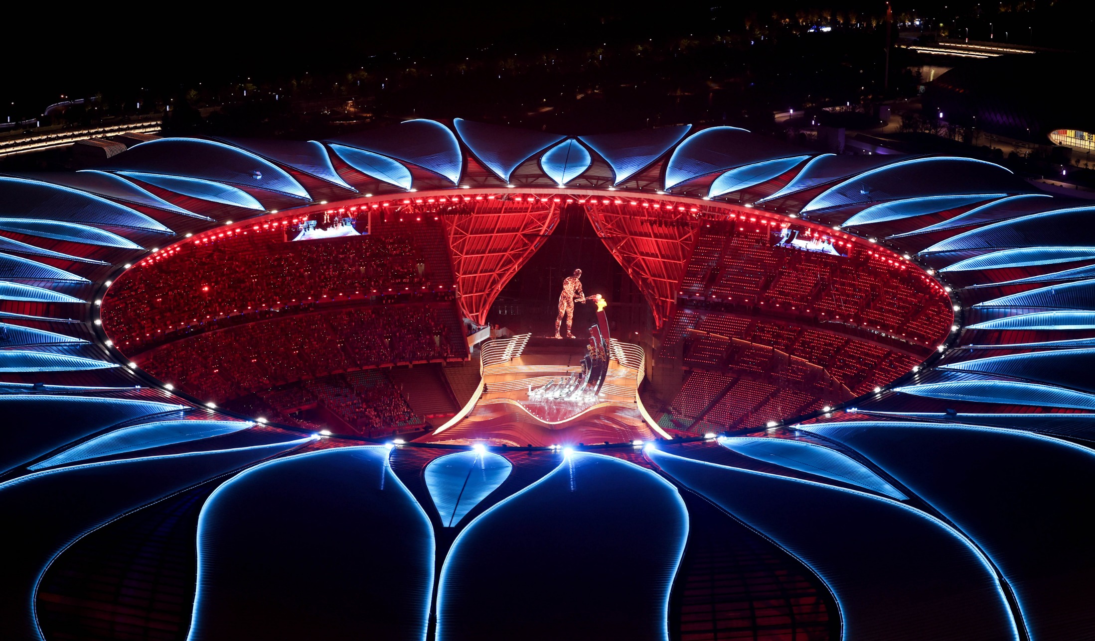 2023年9月23日,最后一棒火炬手汪順和數(shù)字火炬手在杭州亞運(yùn)會開幕式上點(diǎn)燃主火炬。新華社記者 程婷婷 攝