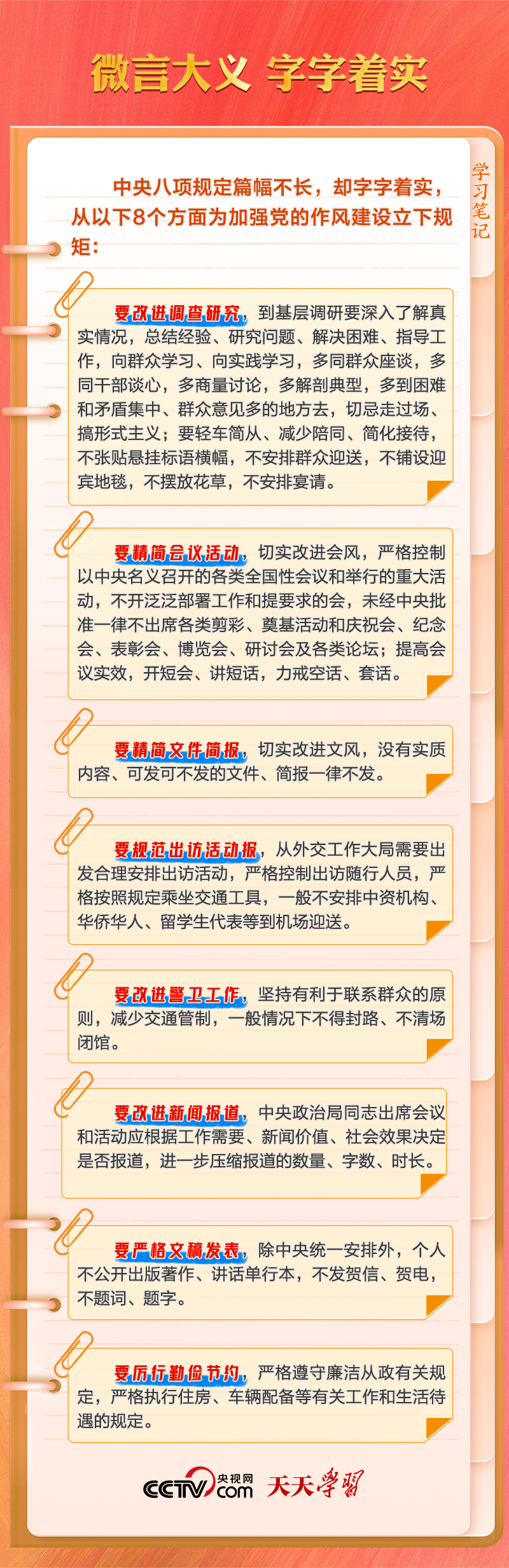天天學(xué)習(xí)在二十屆中央紀(jì)委二次全會(huì)上,習(xí)近平總書記指出:“制定實(shí)施中央八項(xiàng)規(guī)定,是我們黨在新時(shí)代的徙木立信之舉,必須常抓不懈、久久為功,直至真正化風(fēng)成俗,以優(yōu)良黨風(fēng)引領(lǐng)社風(fēng)民風(fēng)。”