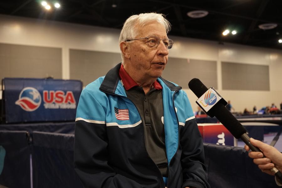2023年12月16日,中美“乒乓外交”親歷者戴爾·斯威里斯在2023年美國乒乓球公開賽老年組比賽間隙接受新華社記者專訪。