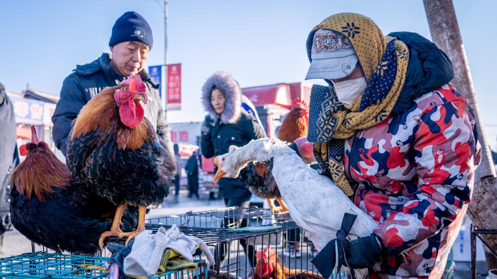 “凍梨凍柿子嘞,嘎嘎甜,不甜不要錢”“冰糖心蘋果賤賣嘍,3斤10塊”“排骨18塊1斤,棒骨8塊1斤”……臨近年關(guān),吉林省長春市近郊的卡倫大集上,人群摩肩接踵,叫賣聲此起彼伏。這個中國東北農(nóng)村集市年味漸濃。