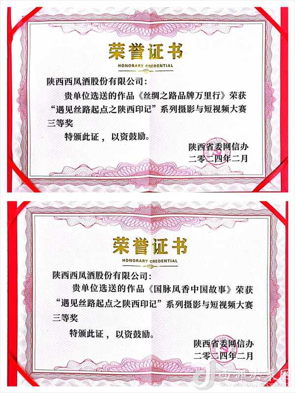 西部決策網(wǎng)訊(記者劉玉 韓宗憲 通訊員 雒文峰)2月4日,由陜西省委網(wǎng)信辦主辦,環(huán)球網(wǎng)承辦的“遇見絲路起點(diǎn)之陜西印記”系列攝影與短視頻大賽頒獎(jiǎng)儀式在西安市東方大酒店隆重舉行。陜西省委網(wǎng)信辦副主任馬衛(wèi)東,環(huán)球網(wǎng)總經(jīng)理單成彪,大賽獲獎(jiǎng)作品創(chuàng)作者及獲獎(jiǎng)單位代表50余人出席頒獎(jiǎng)儀式,西鳳股份公司榮獲大賽攝影與短視頻作品兩項(xiàng)大獎(jiǎng)。