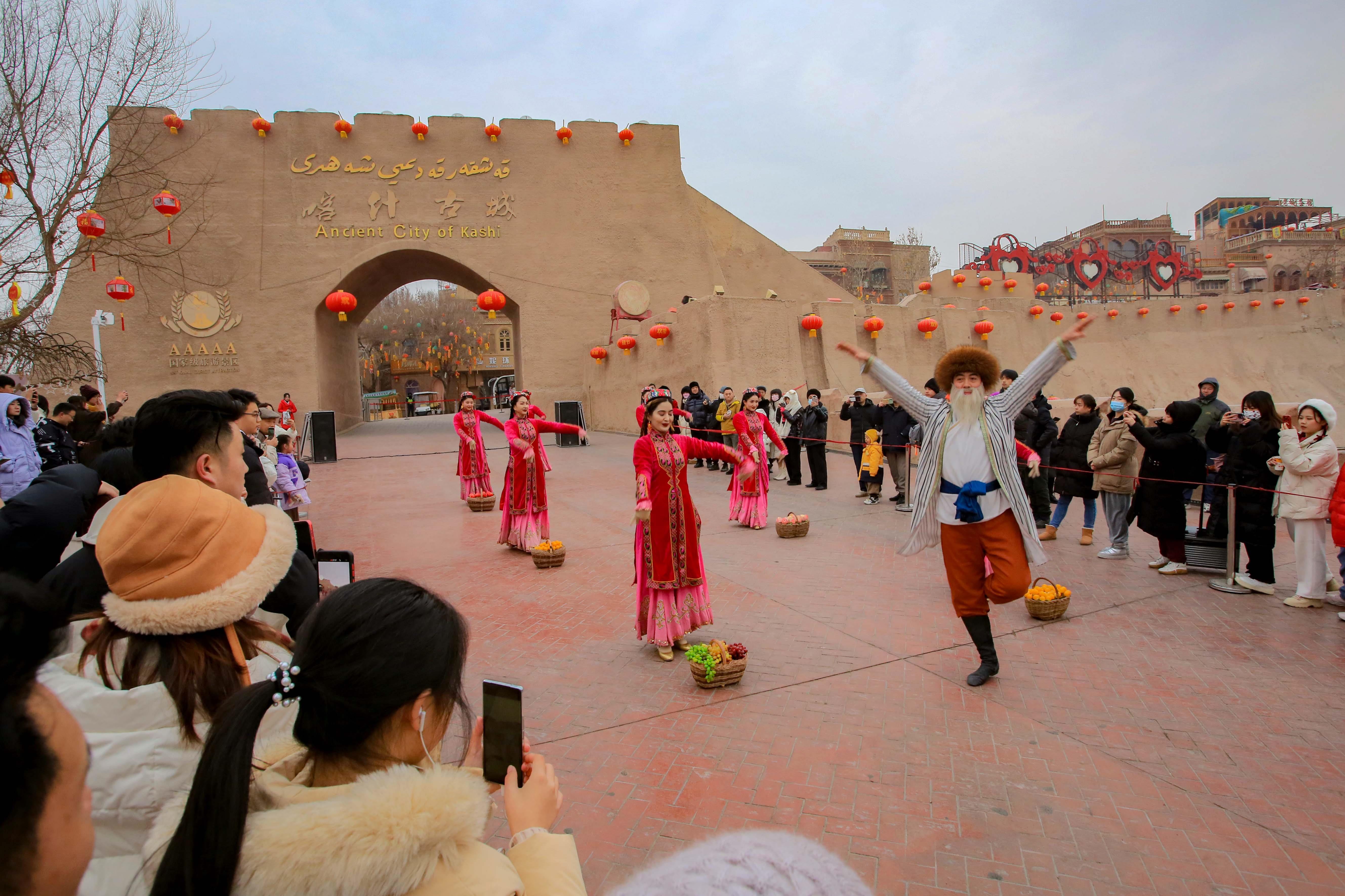 △2024年2月4日,演員在新疆喀什古城入城儀式上表演舞蹈。