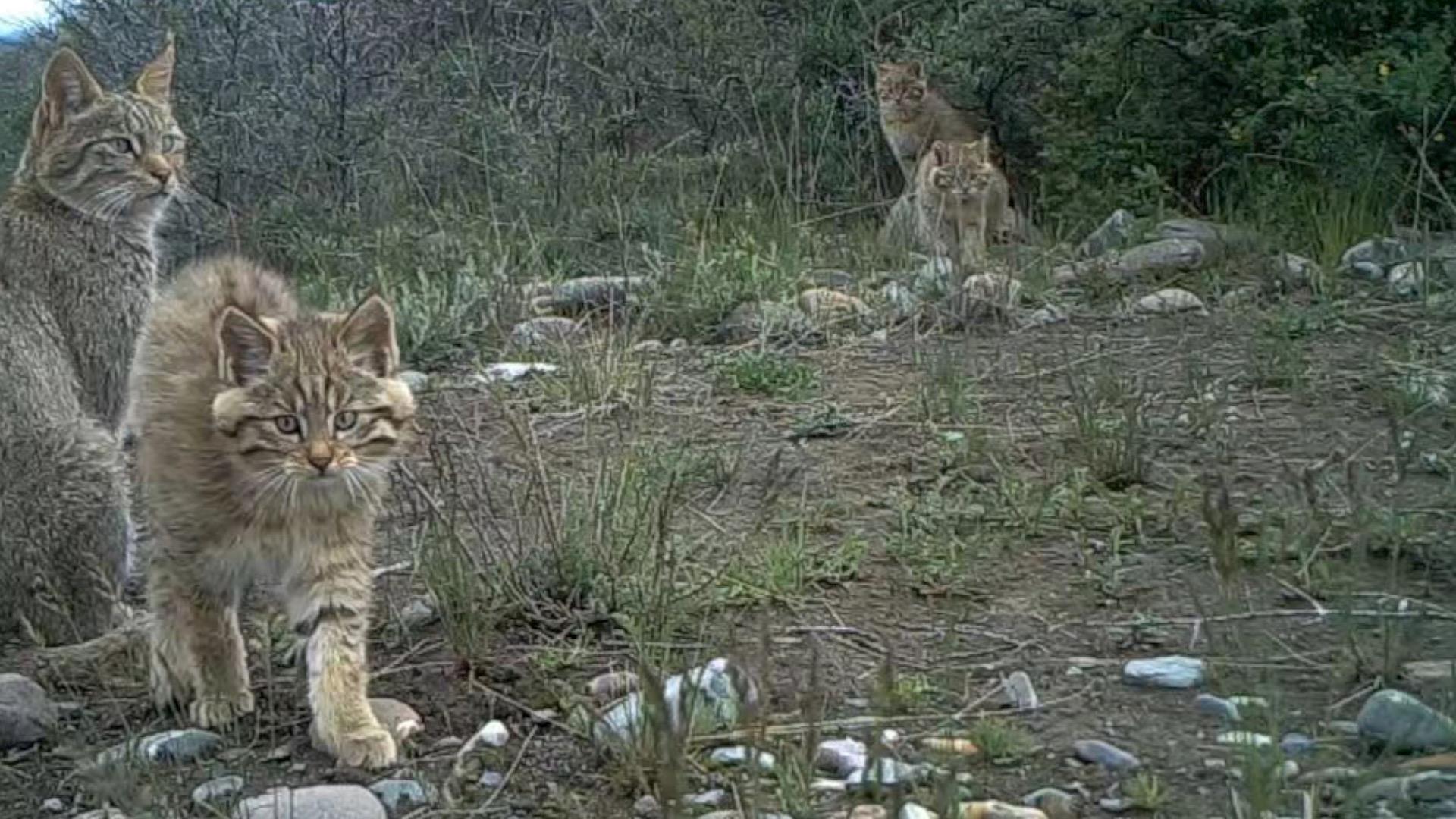 照片中的“大萌貓”一張是漫步在草叢中的荒漠貓,另一張是行走在樹叢中的雪豹。二者都是國家一級保護野生動物。
