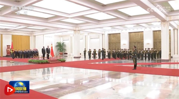 天安門廣場鳴放21響禮炮,禮兵列隊致敬。兩國元首登上檢閱臺,軍樂團奏中安兩國國歌。洛倫索在習(xí)近平陪同下檢閱中國人民解放軍儀仗隊,并觀看分列式。