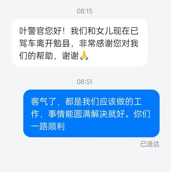 經(jīng)詢問,兩人是貴州貴陽人,其女兒饒某因家庭矛盾離家出走勉縣尋找網(wǎng)友嚴(yán)某,至今已失聯(lián)半個(gè)月。夫妻倆心急如焚,駕車從貴陽趕到勉縣,由于人生地不熟,便想到派出所尋求幫助。了解情況后,接警民警及時(shí)將指令下達(dá)給社區(qū)民警。社區(qū)民警會(huì)同警務(wù)助理及社區(qū)工作人員開展尋人工作,經(jīng)過不懈努力,終于在嚴(yán)某租住的民房內(nèi)找到饒某,并將其帶回派出所。