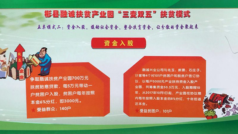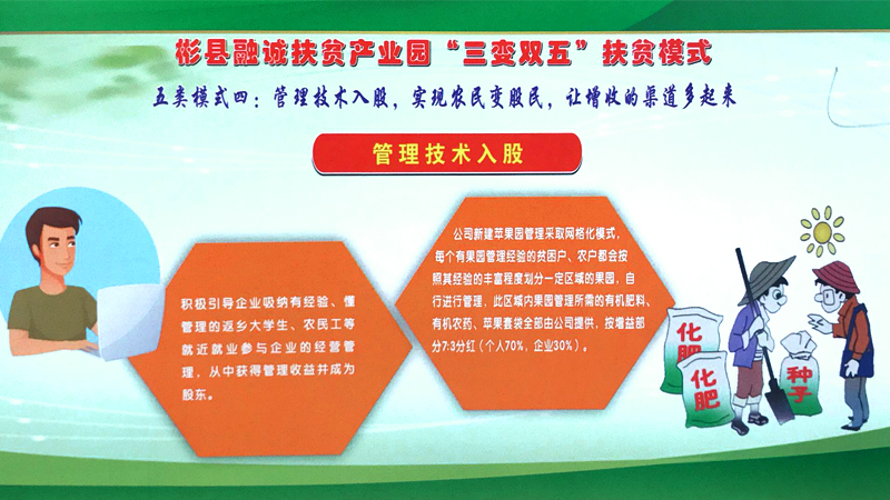 彬州融誠集團公司按照“企業(yè)主導、政府搭臺、群眾參與、社會共建”的思路,圍繞主導產(chǎn)業(yè),緊盯市場需求和脫貧政策動向, 在外出考察學習的基礎上,借鑒貴州省六盤水市“三變”改革的成功經(jīng)驗,以“資源變資產(chǎn)、資金變股金、農(nóng)民變股東”三變改革為基礎, 探索總結出了符合融誠實際的“三變雙五”新模式。